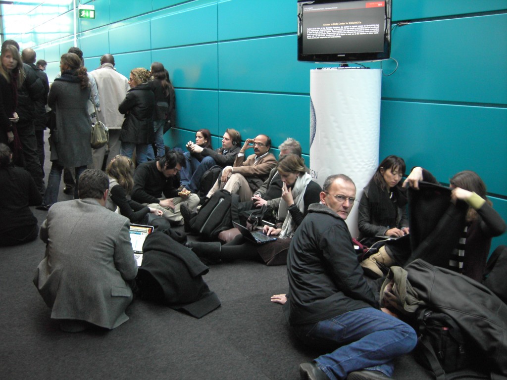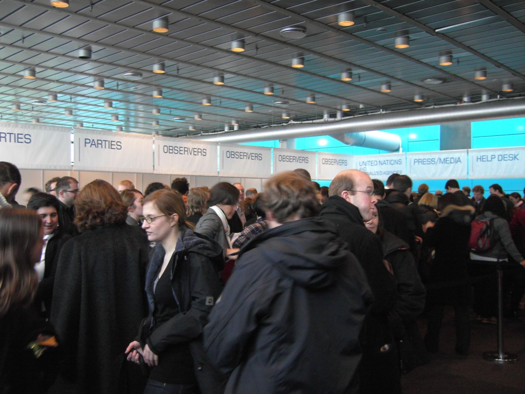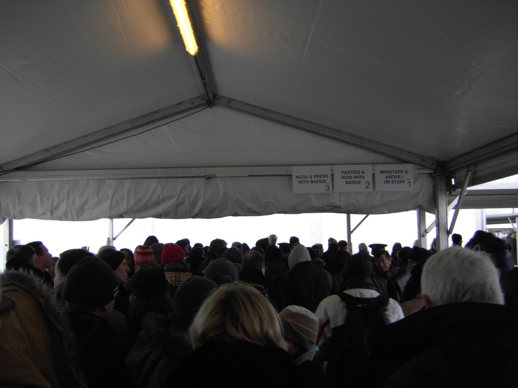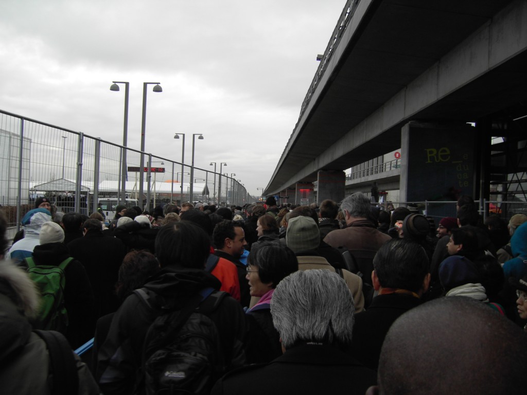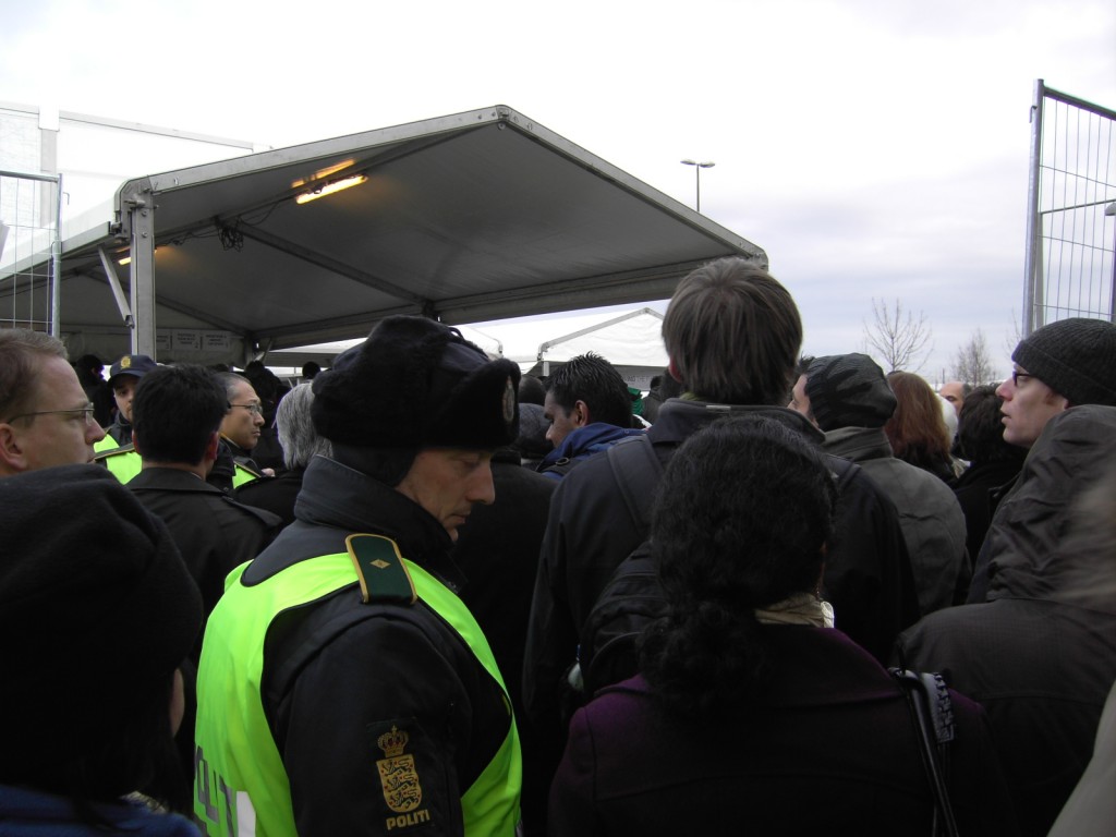 I arrived at Bella Center at 9:30 AM and after what happened yesterday (CHAOS!!!!), they decided to close Bella Center metro station that is just in front of the conference center entrance. Now, we have to get down at Sundby and walk 15 minutes to find the end of the GIANT line to come inside. Thing are still REALLY confusing here. Today is the first day with the secondary badge system and I had to stand about an hour in the cold outside to be able to come in. Some people were talking about the fact that Brazil has more than 700 people accredited as “Party”.Party members and Press don’t need to take the line. Some people were saying that they felt like they were in the line to take bread in the Soviet Union. I’m not kidding. Nothing is organized here. I know the security has to be very strict here, but it’s not fair to leave people outside for hours in the winter waiting to come in. People are here to work, not to stand in lines as if they are waiting for a rock concert or to go in a Disney World ride!!!! Below you can see some pictures of this morning.