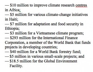 A second concern is the allocation of $293 million (three quarters of Canada’s total) towards the International Financial Corporation. The IFC, according to its website, is “the private sector arm of the World Bank Group (and) shares its mission.” Giving this money to the IFC can only serve to fuel the trust-deficit between the Global North and Global South. Everyone seems to agree coming out of Copenhagen that the essential task now is to rebuild trust between North and South. Negotiators need to develop a sense of good-faith, transparency, and accountability among one another in order to gather momentum for Cancun. Does giving our money to the IFC deflate the efforts to build trust?