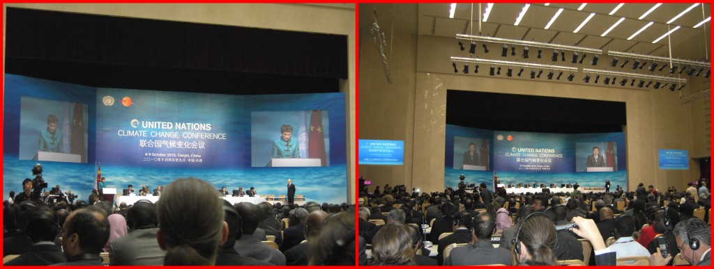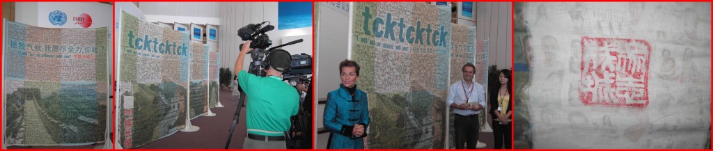 Logo no começo do dia, na entrada do suntuoso centro de conferência (fotos acima), havia a “Grande Muralha do Clima”, que foi carimbada pela secretária-executiva da Convenção de Clima, Christiana Figueres, com as palavras “com a determinação de todos, podemos vencer qualquer coisa”. Os murais que ilustram a muralha do clima estão repletos de fotos de pessoas que estão fazendo sua parte com relação ao combate às mudanças climáticas. Christiana disse: “Lidar com as mudanças climáticas não é apenas os governos tomarem as decisões que precisam tomar, é sobre cada um de nós ter a vontade de mudar o nosso comportamento em nossas vidas. E é também sobre todos nós decidirmos coletivamente sobre o tipo de carimbo que queremos deixar na parede da história humana. “