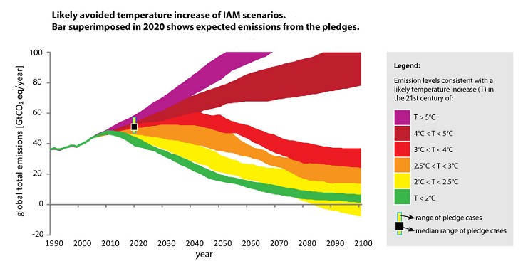 Le graphique montre les différents chemins pour différentes températures (en courleur). Le rectangle noir montre le niveau médian des promesses liés à Copenhague (les barres grises au dessus et en dessous donnent les maximums et minimums extrêmes de ces promesses)