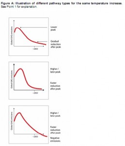 Tout d’abord, le rapport souligne encore une fois que ce qui compte ne sont pas les émissions mais le budget global d’émissions. En conséquence, plus vite on atteint le maximum des émissions mondiales, moins la décroissance des émissions ensuite a besoin d’être brutale.