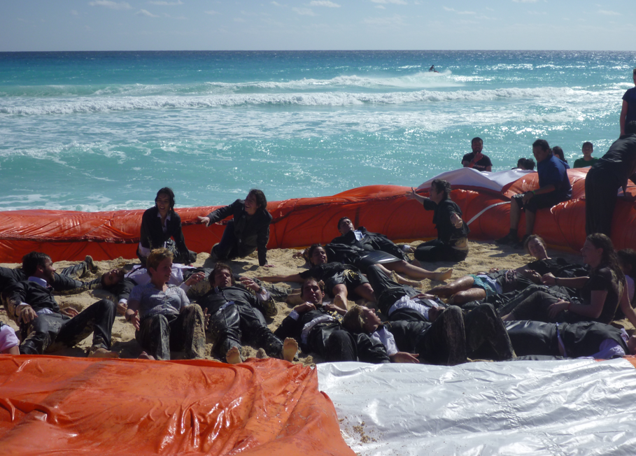 En la acción se representaron negociadores que se hundian, que estaban en el mar y pedían ayuda a la sociedad civil para poder salir del mar. Se les aventó un salvavidas y de ésta manera, ellos podían regresar a la orilla del mar y salvar sus vidas.