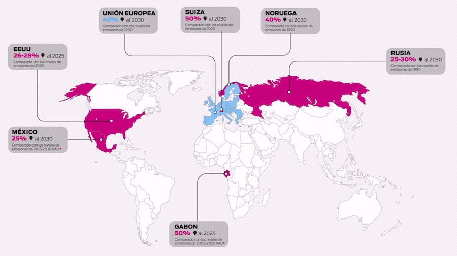Hasta el momento los 28 países de la Unión Europea, acompañados de México, Suiza, Noruega, Estados Unidos, Rusia y Gabón han anunciado oficialmente sus Contribuciones Previstas y Determinadas a nivel Nacional (INDC, por sus siglas en inglés) a la Convención Marco de Naciones Unidas sobre Cambio Climático (CMNUCC) en el primer plazo establecido para ello. En el transcurso de los meses, se espera que las demás partes hagan sus anuncios, allanando así las negociaciones para la COP21 que se realizará en París en diciembre.