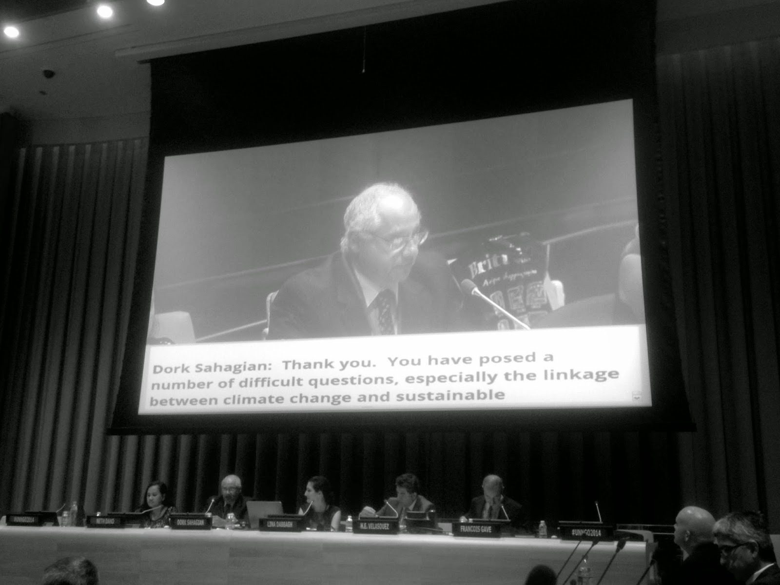 Dork Sahagian (above), an IPCC Nobel Prize winner and professor of Earth Sciences at Lehigh University suggested we think alongside the fabled words of John F. Kennedy “Ask not what climate change will do to the poorer populations but ask what the economic development will do to 7 billion people. Moving away from fossil fuel development in the post-15 agenda is not a current development goal and is necessary, said Dr. Sahagian;